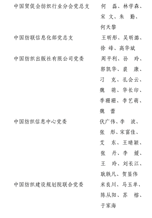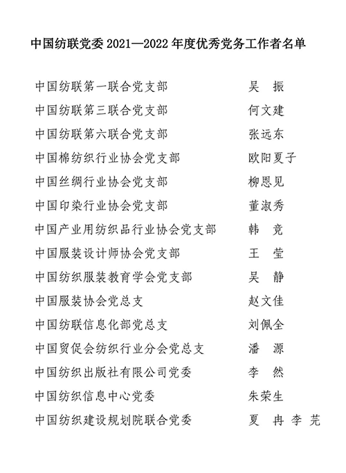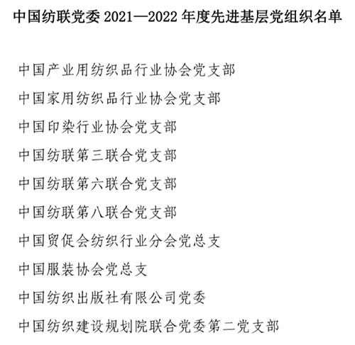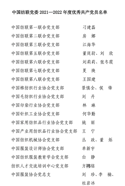 根據《關于評選表彰中國紡聯2021—2022年度“先進基層黨組織”、“優秀共產黨員”和“優秀黨務工作者”的通知》精神和要求,嚴格按照有關工作程序推進,在中國紡聯各基層黨組織認真評比推薦的基礎上,經民主投票評比、中國紡聯紀委審核、中國紡聯黨委批準,決定授予中國產業用紡織品行業協會黨支部等10個基層黨組織“2021—2022年度中國紡織工業聯合會黨委先進基層黨組織”榮譽稱號,授予刁建磊等61名同志“2021—2022年度中國紡織工業聯合會黨委優秀共產黨員”榮譽稱號,授予吳振等16名同志“2021—2022年度中國紡織工業聯合會黨委優秀黨務工作者”榮譽稱號。