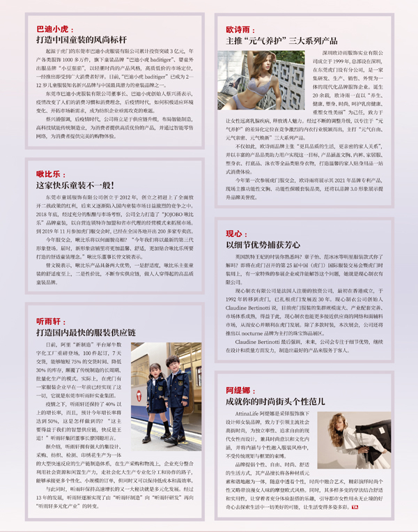 著眼未來,走出疫情陰霾 以時尚語言傳遞城市新風貌,助推武漢高質量發展,武漢時裝周是向全國乃至全球展現“疫后重振武漢樣板”的窗口,是武漢轉型升級、高質量發展的城市名片。武漢經濟強勢反彈,前三季度GDP重回中國城市前十強,武漢時裝周掀起的時尚浪潮,必將點燃全城線上線下消費熱情,成為第四季度撬動城市復蘇的“金杠桿”。 未來,武漢時裝周將以建設中部時尚之都為目標,持續打造中部時尚品牌首發地,引領中部時尚發展趨勢,助力建設國家消費中心城市、國際化大都市;持續培育覆蓋時尚產業全產業鏈的武漢時尚展,著力打造成中部地區最具影響力的時尚交易平臺;持續提升城市宣傳窗口功能,深度融合城市文化、城市品牌、城市地標宣傳,推動時尚與旅游融合發展,向全球輸出武漢城市品牌。 2020武漢時裝周,以時尚發聲,秀出“新一線”時尚內核,向世界證明武漢力量,讓世界看到武漢之光! 走進武漢時裝周 武漢時裝周創始于2012年,每年10至12月間在武漢市舉辦。 作為武漢傳統優勢產業轉型升級的助推器、新興行業成長壯大的加速器,武漢時裝周以創意設計、時尚推廣、品牌建設為重心,推動著城市時尚創意產業、城市時尚消費的發展和紡織服裝產業的轉型升級。在與全球優勢資源對接、汲取外部產業精華要素的同時,扶持本土新生設計力量,提升本土原創時尚品牌和城市藝術文化軟實力,為武漢時尚產業和時尚經濟發展帶來機遇,加速城市成為中國中部地區時尚創意核心平臺的進程,打造出“時尚之都”這張武漢全新的城市創意名片。 以時尚之名解碼虎門服裝產業 第25屆中國(虎門)國際服裝交易會暨虎門時裝周即將亮相 本刊記者-李亞靜 今年以來,新冠肺炎疫情給世界政治環境、經濟環境都帶來了較大變化,也給紡織業的發展帶來了極大的不確定性。下半年,隨著國內新冠疫情得到有效控制,紡織服裝產業在新科技、新渠道的助力下率先復蘇,實現了平穩發展。作為“中國女裝名鎮”“中國童裝名鎮”“國家火炬計劃東莞市虎門服裝設計與制造產業基地”“世界級紡織服裝產業集群先行區”的虎門,在這場疫情后的經濟復蘇行動中,也呈現出了嶄新的發展勢頭。 11月19—22日,虎門即將迎來一年一度的服裝盛事——第25屆中國(虎門)國際服裝交易會暨虎門時裝周(簡稱“虎門服交會”)。本屆服交會展場總面積將達30多萬平方米,同時還設有20個分會場,包含鎮內各大服裝商場、面輔料市場、小商品市場、電商園區等。