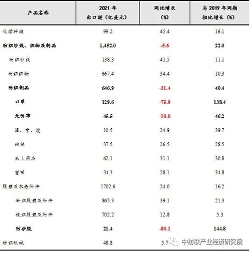 從產業鏈角度看,全球疫情防控常態化后,我國紡織品服裝出口中涉及防疫的口罩、無紡布、防護服等產品出口快速下降,全年分別下滑了75.9%、10.0%和80.1%;但疫情仍在持續,這些產品出口仍比疫情前有大幅增長,分別比2019年增長138.4%、42.2%和144.8%。