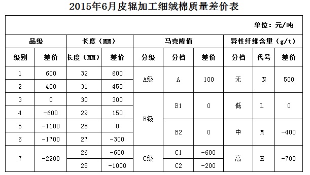 根據《中國棉花協會國產棉質量差價表定期發布辦法》的規定,現正式發布2015年6月《鋸齒加工細絨棉質量差價表》、《皮輥加工細絨棉質量差價表》和《長絨棉質量差價表》。