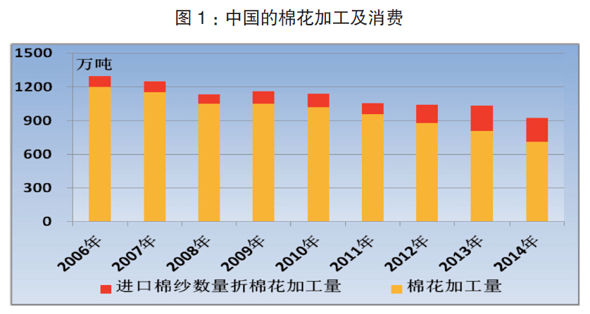 2000~2010年,中國對棉花的需求持續增長,特別是2005~2010年,棉花年均消費量超過1000萬噸。自2011年起,受收儲政策、市場需求及成本影響,棉花加工量減少。中國的實際需求與預期并不完全一致,據中國棉紡織行業協會(以下簡稱中棉行協)測算,2014年棉花加工量710萬噸,實際上中國對棉花的總體消費需求不僅是這一數量,還應包括大量的進口棉紗。