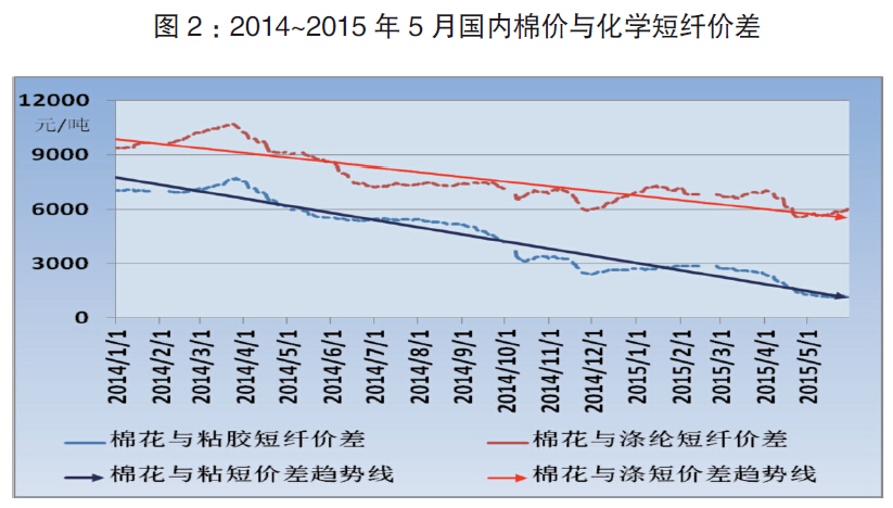 2015年4月起,粘膠短纖價格上揚,棉價維持弱勢下行,國內棉價與粘膠價格之差縮小至約每噸1000元,如用量較大且交通較方便的地區,價差只有每噸幾百塊。從化纖消費情況看,棉花與化纖價差縮小,有利于棉花使用量的增加。