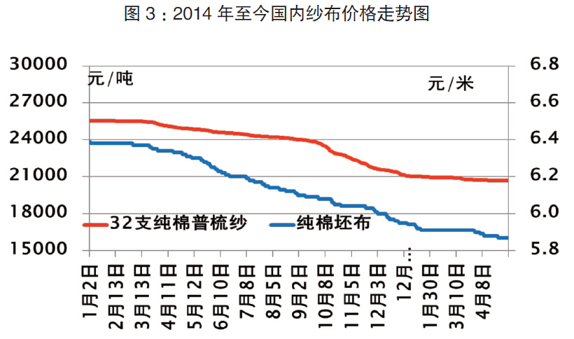 根據中棉行協調研,2015年春節后,棉花采購連續兩個月增加,5月份略減。大企業的棉花庫存相對較多,而小企業因為訂單、資金以及需求等情況,棉花庫存相對較少。相比之下,非棉纖維尤其是化學短纖的消費是增長的,同比增長3.43%。從目前消費量上看,非棉短纖維年使用數量已經超過1200萬噸(如果加上經紗使用長絲,這個數量將更多)。受市場影響,紗布價格跌幅同比放緩。截至5月底,純棉普梳紗線、純棉坯布價格累計下跌2.5%左右。