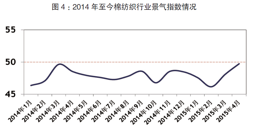 1~4月,棉紡織行業用電量累計同比增加4.5%,紗產量累計同比增加4.1%,布產量累計同比減少0.6%。紗布銷售量同比增加,庫存量同比減少。整體而言,棉紡織行業盡管還比較困難,但與去年同期相比有所好轉。從中棉行協2014年起跟蹤棉紡織行業的景氣指數情況看,盡管景氣指數仍位于50以下,但近兩個月呈現上升趨勢,這給棉紡織企業帶來一定信心。