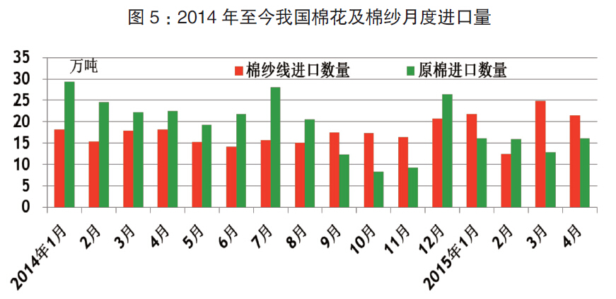 從目前的市場情況看,預計紗線進口的熱度仍會增加,究其原因,國內織造企業為降低成本,會選擇價格更低的進口紗來滿足紗線原料的需求,進口紗的生產使用的是中國以外各個國家的棉花,因此在質量等方面更能有保證。2015年1~4月,進口紗繼續增加,從這個方面也部分替代了國內的用棉量,海關數據顯示,從印度、巴基斯坦和越南三個國家進口的棉紗數量已經超過2011年全年的進口量。截至5月底,預計棉花月平均使用量是50萬噸左右,進口紗替代了一部分棉花消費。