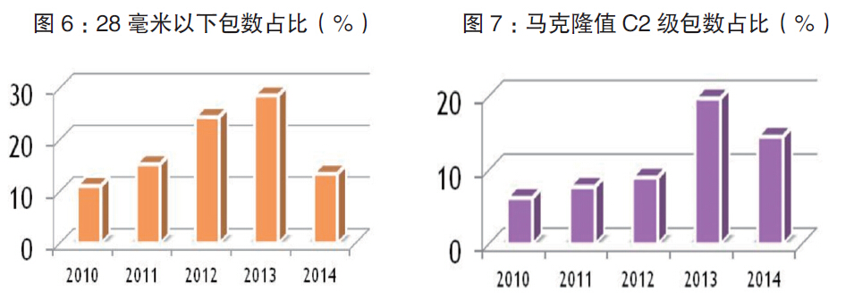 2014年目標價格補貼政策實施,棉花質量較臨時收儲時期有所提升。從各項數據對比可以看出,新疆棉花的質量情況要好于全國整體情況。從長度指標來看,28毫米以下的低質棉包占比一直上升,直到2014年下降,有所好轉。從馬克隆值情況來看,C2級包數占比從2010年的6.27%上升到2013年的19.75%,雖然2014年有所改善,但仍然在14.57%的較高比例。新疆棉花質量變化稍好于全國情況,最近一年新疆機采棉引起大家的特別關注,這也加快了機采棉質量的提高,相信未來幾年一定會有大的變化,棉紡企業對此很期待。