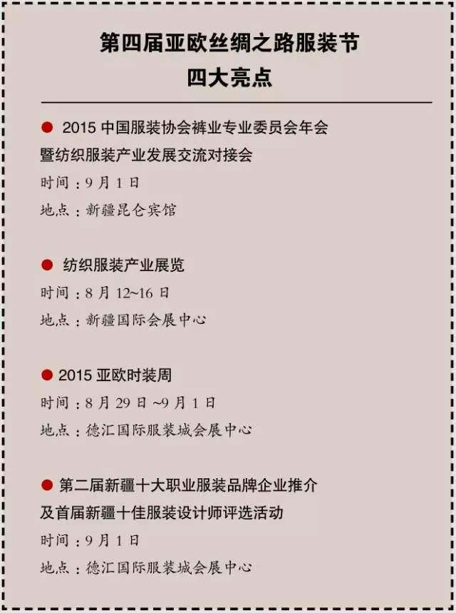 優(yōu)質(zhì)活動促進產(chǎn)業(yè)合作 據(jù)悉,第四屆亞歐絲綢之路服裝節(jié)期間將舉辦多項系列活動,包括2015 中國服裝協(xié)會褲業(yè)專業(yè)委員會年會暨紡織服裝產(chǎn)業(yè)發(fā)展交流對接會、紡織服裝產(chǎn)業(yè)展覽、2015亞歐時裝周、第二屆新疆十大職業(yè)服裝品牌企業(yè)推介及首屆新疆十佳服裝設(shè)計師評選等。 作為服裝節(jié)的重點活動之一,2015 中國服裝協(xié)會褲業(yè)專業(yè)委員會年會暨紡織服裝產(chǎn)業(yè)發(fā)展交流對接會將于9 月1 日在新疆昆侖賓館舉辦。