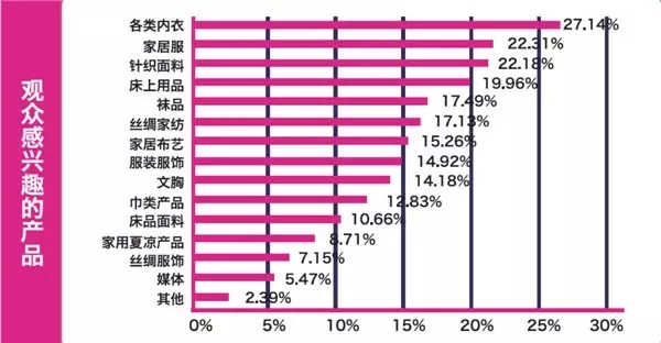 新一屆展會,將力求在新常態下為中國家紡家居、內衣服飾樹立新標桿,在交互中尋求新突破,分享新經驗,發現新寶典;在國家“一帶一路”和“西部大開發”戰略下,通過互聯網+,開展高端論壇,為“中針會”電商、眾籌、終端渠道等洞悉盈利新模式;展會期間大家居、全產業鏈的為觀眾帶來情景模式,全心為觀眾帶來感官購買、體驗消費,以新產品、新動向帶來體驗生活新夢想,令“體驗經濟”如約而至;牽手合作新伙伴,緣定巴蜀,以無限商機發現新西部、投資新領域、感受新紡織。 活動異彩紛呈 海量信息呼嘯而來 為使每一位展商與觀眾在展會期間得以了解高端專業的行業信息,把握產業走向,洞悉市場發展趨勢,中國針棉織品交易會將為參與者提供五大亮點: “霓裳絲路,美模奪目”,云集設計大咖與大牌豪門全新發布解讀流行趨勢; “皇冠大獎,隆重表彰”,權威發布品牌影響力大獎,重磅表彰家紡家居、內衣服飾年度人物; “巨商精英,論道財富”,阿里、天貓、京東、唯品會、聚劃算等互聯網大佬聚首“中針會”,上百家渠道商悉數到齊,共探眾籌、融資、上市等全新議題; “大咖流動,潮流聚尚”,設計大腕、潮流達人掀起潮流新風暴,揭秘尖叫產品創新之道; “中央媒體,全景報道”,中央、地方權威媒介,電視臺、報紙、雜志、新媒體齊匯“中針會”,海量信息一網打盡,時尚觀點新鮮出爐,深度傳播媒體辣評。 本屆展會,通過專業的數據分析,將主要迎來生產企業、經銷商/代理商、加盟商、百貨商場、網店、連鎖超市等專業觀眾與企業;并經過調研匯總,得出觀眾最感興趣產品如圖: