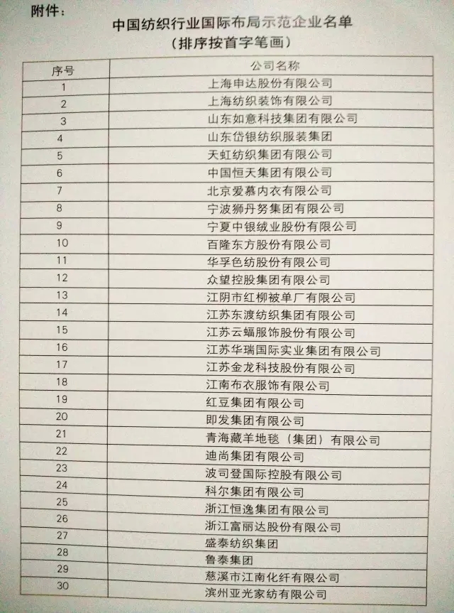 徐迎新還表示,“中國(guó)紡織工業(yè)聯(lián)合會(huì)將一如既往本著為全行業(yè)共同利益奮斗的宗旨,積極開(kāi)展紡織服裝企業(yè)進(jìn)一步“走出去”的各項(xiàng)服務(wù)工作,積極建設(shè)好紡織工業(yè)海外投資合作的信息平臺(tái)、投資考察平臺(tái)、業(yè)界交流平臺(tái),在紡織業(yè)國(guó)際產(chǎn)能合作和海外投資布局方面努力發(fā)揮好政府和企業(yè)的橋梁紐帶作用! 會(huì)上還對(duì)“中國(guó)紡織行業(yè)國(guó)際布局示范企業(yè)”進(jìn)行了表彰,具體名單如下: