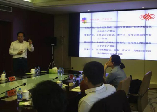如意集團總裁邱棟向調研組講解集團轉型升級的產業定位。 據了解,在提升企業整體競爭力方面,如意集團近兩年投資了200億元,購入先進設備,實施工業信息化整合,實現產業轉型升級。 從近年來如意集團主動實施“走出去”戰略的實踐經驗看,邱棟預計未來5~10年,中國紡織產業有很大的提升空間,他建議:“國家相關部門可以把紡織產業上升到國家戰略層面進行扶持,因為紡織制造的核心技術在中國,紡織制造的頂尖裝備也在中國,政府對紡織行業應該加大扶持力度,制定更多的政策,推動科學技術轉化,鼓勵品牌轉型提升”。 |