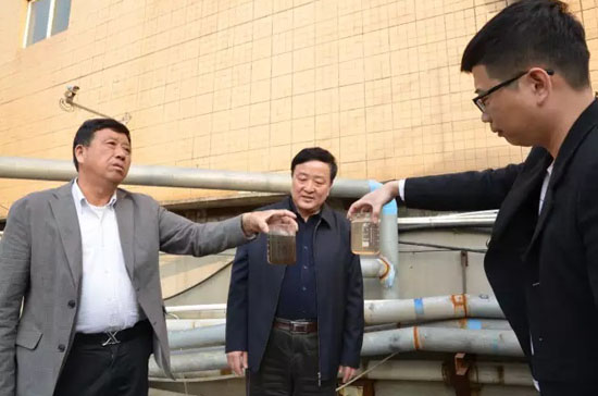 調研組一行在海天環境工程公司對廢水和處理后的水進行比較。 海天環境工程公司承擔著周邊染整企業的廢水處理工作,在公司監測設備上,記者看到經過處理過的廢水COD穩定在80,完全達到直接排放的標準要求。 |
