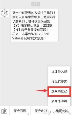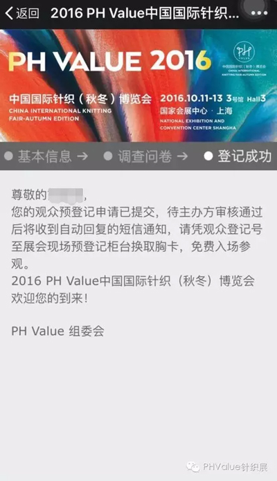 或添加微信號(hào):PHValue針織展 2/點(diǎn)擊菜單攔“我要參加”中的“觀眾預(yù)登記”