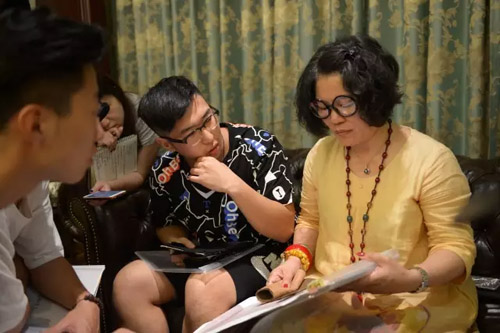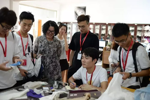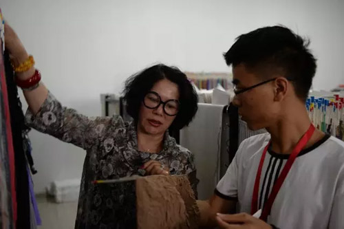 在設計指導上,李老師并不主觀局限各位學員的設計思路,她習慣用啟發的方式和商量的口吻,她認為雖然是首屆華服設計大賽的導師,但她希望學員們的設計是自己獨立思考的結果。大家這兩天的友好相處以及跟大量面料的“親密接觸”可以激發各位學員的制作靈感。