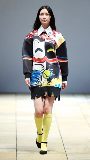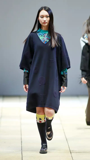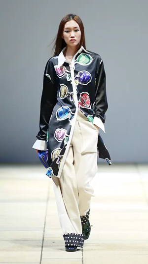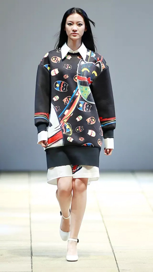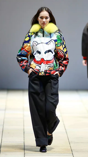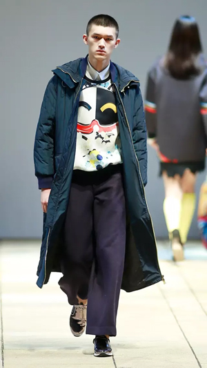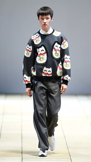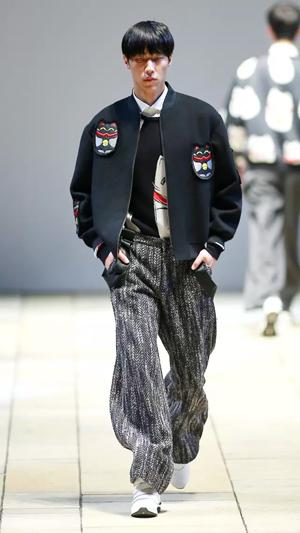 上世紀80年代流行的落肩款式強勢回潮,被大量運用到本季的新品種,有一種偷穿媽媽衣服的滿足感。沖撞的色彩,大膽、前衛,配以反差萌的卡通形象,尤其以貓咪、蝴蝶等幻化成的紋樣,期間包含的祝福寓意及青春沖動,瞬間將心緒拉回至真至美的童年。小面積熒光色成為點睛之筆,成為沉穩濃烈的深色大衣出脫泯然的魔法設計,在領口、前襟、衣袋邊抓取眼球。 看似隨意的涂鴉畫作,被鏤空紐帶紋飾覆蓋,隱綽的視覺效果隨著身體擺動流露出不經意的趣味,各種矛盾又奇跡般協調,打破平衡的同時又自覺回到平衡的美學體驗,讓服裝不再是身體的束縛,而成為當下都市都市智識青年表達自我、彰顯自由的最佳選擇,這就是自由搭配的魅力。