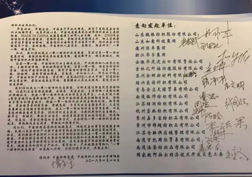 聯盟意向發起單位簽字儀式。 “一帶一路”紡織交易聯盟意向發起單位名單 山東魏橋紡織股份有限公司 山東如意科技集團 德州恒豐集團 浙江華孚集團 安徽華貿進出口有限責任公司 吉林化纖福潤德股份有限公司 蘇州金輝新材料有限公司 紹興東源針織有限公司 青島金莊天緣貿易有限公司 南通銀帥紡織有限公司 江蘇紹潤紡織有限公司 杭州富馳紡織有限公司 常州嘉多寶紡織品有限公司 常州市棉超紡織品有限公司 江蘇倉融供應鏈管理有限公司 南通百凱國際貿易有限公司 南通洛榮紡織品有限公司 國家級阿拉爾經濟技術開發區黨工委 (圖片來源:中國紡織經濟信息網) |