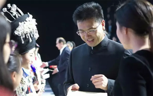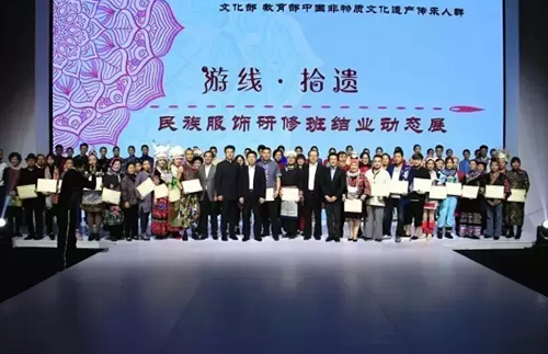 本刊記者-劉萍 10月15日,文化部、教育部中國非物質文化遺產傳承人群民族服飾制作技藝、傳統印染技藝研修班結業成果展在北京服裝學院隆重舉行。靜態展和動態秀的緊密結合,給了非遺藝術一個完整而豐富的表達。 當日下午,由文化部、教育部主辦,北京服裝學院承辦的中國非物質文化遺產傳承人群民族服飾制作技藝、傳統印染技藝研修班結業動態秀在北京服裝學院1號秀場舉行。中國工程院院士俞建勇,文化部非遺司副司長王晨陽,中國服裝設計師協會副主席熊兆飛,北京市教委原副主任張國華,北京服裝學院領導馬勝杰、劉元風、倪賽力、艾麗、蔣達峰、廖青、賈榮林出席結業秀。 此次結業作品展演以“游線·拾遺”為主題,共有三個系列,涵蓋7個民族10余種傳統手工藝。第一系列為[蝶?裳華],第二系列為[藍?衣夏],第三系列為[盛?襟元]。 靚麗的T臺上,北服服裝表演專業的本科生演繹著少數民族的古老技藝與現代設計交融碰撞出的作品,讓400多位與會人士在欣賞彰顯民族特色、創新設計的同時,更被這帶著手工溫度的技藝和生生不息的傳統文化深深打動。最后,王晨陽、馬勝杰為38名圓滿完成研修的學員一一頒發結業證書,并祝愿大家在非遺保護、傳承、創新的道路上開拓進取,勇創佳績。