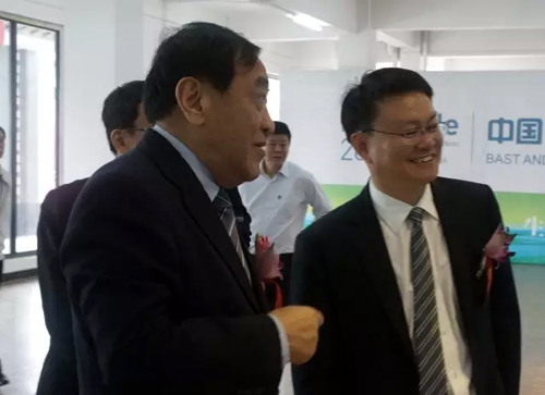 中國紡織工業(yè)聯(lián)合會黨委書記王天凱(左)與江西新余市人民政府副市長萬廣明交流麻藝視界時尚中國國際時尚攝影大展的情況。