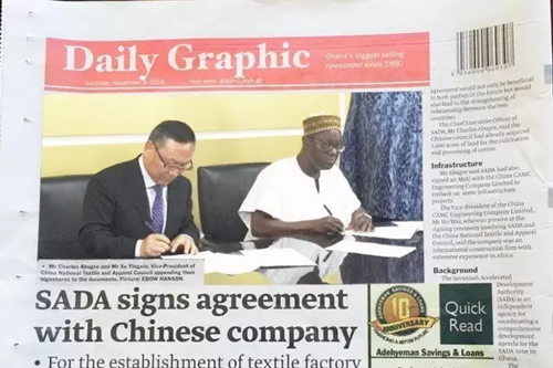 Mahama總統對中國紡織工業聯合會與SADA簽署關于發展棉花種植與紡織業的諒解備忘錄非常高興,也表示加納政府將全力支持雙方進一步的合作行動。徐迎新在會見中表示,對加納發展棉花生產的資源稟賦持非常積極的態度,并將和SADA一起努力,進一步促進中國紡織企業對加納的全面了解,積極促成潛在的合作項目投資。