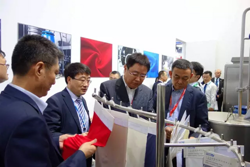 中國恒天集團董事長張杰一行參觀恒天立信展臺。 恒天立信在ITMA ASIA+CITME 2016展示旗下最強裝備,包括立信染整DYECOWIN高溫染色機、JUMBOTEC PLUS高溫染色機、SUPERWIN高溫筒子紗單向外流染色機、特恩SYN 8 SUPER高溫氣流染色機、高樂SINTENSA CYCLONE TANDEM高效水洗機、立信門富士MONTEX 6500定形機、ECO BOOSTER熱回收系統(tǒng)、Monfongtex預(yù)縮機模塊、德國門富士TIMATEC涂層設(shè)備及其以嶄新“魔術(shù)鏡”展示針對不同織物的設(shè)備配置,成為此屆紡機展的一大亮點。 展會前已備受矚目的DYECOWIN高溫染色機首次登場,其為恒天立信精心研發(fā)的全新高溫染色設(shè)備,突破傳統(tǒng)設(shè)計,以提升處染化纖的生產(chǎn)效能為方向,配合先進的科研技術(shù),大大降低染色浴比,當(dāng)中更有多項專利設(shè)計,為客戶的生產(chǎn)效率帶來新的標(biāo)準。DYECOWIN在展前已取得超過50臺的意向訂單,展會期間更得到不少中外客戶的青睞。