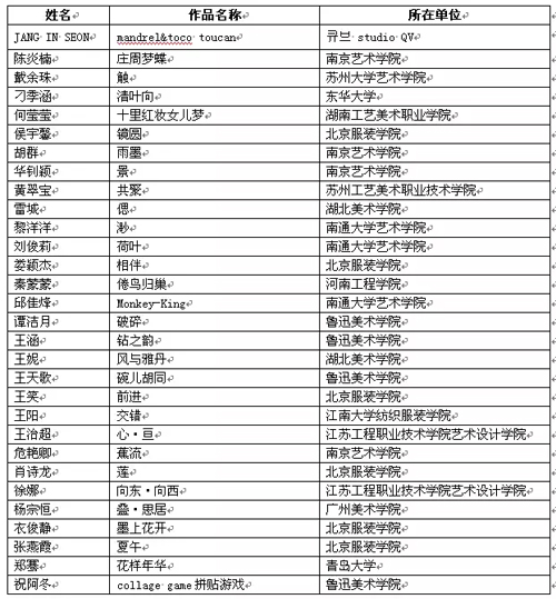 銅獎獲獎者及指導老師。 本屆大賽由中國家用紡織品行業協會與江蘇省蘇州市吳江區人民政府主辦,中國家用紡織品行業協會設計師分會、震澤鎮人民政府和吳江絲綢文化創意產業園聯合承辦。 大賽共收到參賽作品1575幅,經過專家評審委員會的層層遴選,最終評選出金獎1名、銀獎3名、銅獎5名、優秀獎30名、最佳創意設計應用獎5名、最佳設計題材獎5名、最佳傳統紋樣表現獎5名,入圍獎若干。