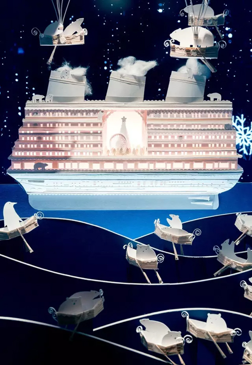 當然,也少不了經典的禮物櫥窗啦!在這里,你能找到多少只可愛的貓貓狗狗呢? 巴黎 今年老佛爺商場的圣誕裝扮是由法國紙質藝術家Lorenzo Papace完成的“極地圣誕”。作品描述了在一個積雪冰冷的國度里,探索一個北極熊家族的非凡傳奇故事…… 受到冰雪融化的影響,北極熊和熊崽們離開北極,尋找一塊全新大浮冰。 在無盡的白色世界里經過長途跋涉之后,它們驚喜地發現了老佛爺百貨打造的一塊全新大浮冰。 一次神奇的體驗正在等待著它們!