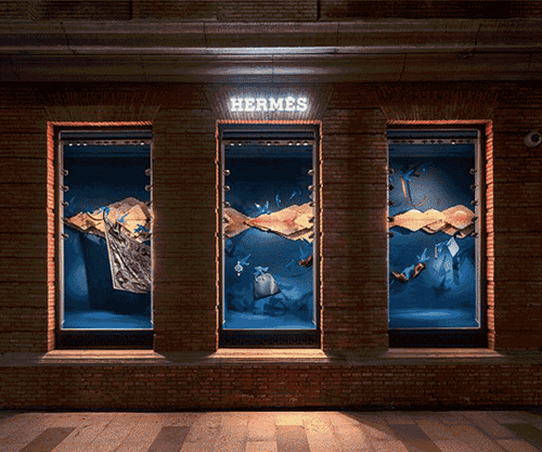 Prada 2016圣誕櫥窗以零距離的親密視角呈現全新的2017早春系列。極簡風格的鉑金色球體規則排列,完美化身櫥窗背景,而鏡面裝飾則給人以無限的空間感及精致的現代奢華感。 上海 HERMES 愛馬仕的春季和冬季櫥窗往往是備受關注的奢侈品視覺陳列對象。今年,上海“愛馬仕之家”2016冬季櫥窗于11月24日揭幕,主題為“映”,由新銳陶瓷藝術家辛瑤遙打造,她以自然界中水的不同存在方式為創作主線,將冬季櫥窗變為表達水面倒影美感與色彩的自然空間。