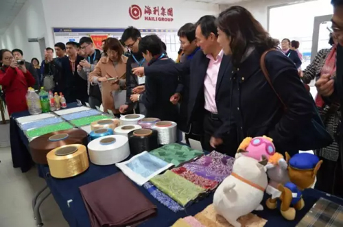 作為此次推廣活動的一大亮點,在會場外的走廊中,來自浙江金霞新材料有限公司、廣東新會美達錦綸股份有限公司、寧波大發化纖有限公司等26家企業以標準展位形式向代表們推介了各自的綠色纖維新材料,上海正家牛奶絲科技有限公司還展示了易熱寶功能性纖維,受到與會代表的歡迎。 與會代表還參觀了海鹽海利環保纖維有限公司15萬噸/年的廢棄聚酯瓶加工清洗生產示范線和20萬噸/年再生聚酯生產示范線,大家對設備的自動化程度和智能化程度表示贊賞,對海鹽海利堅持綠色發展理念表示欽佩。