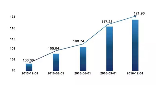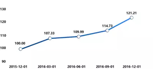 花樣版權成果豐碩。2016年第四季度花樣版權指數達127.78點,環比增加3.05點,漲幅為2.45%。第四季度花樣版權數小幅增加,第三季度花樣版權數漲幅最大,達13.36%。 3、創意企業指數 2016年第四季度創意企業指數達121.21點,較第一季度上漲13.88,漲幅為12.93%。柯橋區以F5創意園、科技園和中國輕紡城創意園“三大園區”為載體,吸引入園企業,集聚時尚人才。 圖1-4 創意企業指數