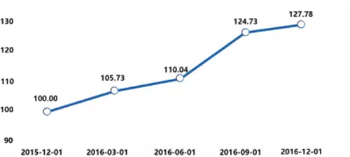 2、新花型推出指數 2016年第四季度新花型推出指數達127.78點,較第一季度增加22.05點,增幅為20.85%。 圖1-3 新花型推出指數