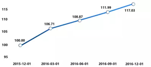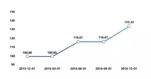 3、外商駐點指數 外商駐點指數通過辦事處個數、注冊公司數、人次等指標反映柯橋外商入駐的情況。2016年第四季度,該指數為113.07點,與第一季度相比較,指數上升9.78點,漲幅為9.47%,上漲幅度較大,說明外商愈發傾向入駐柯橋時尚行業,這也為柯橋注入了一批新鮮的時尚血液。 |
