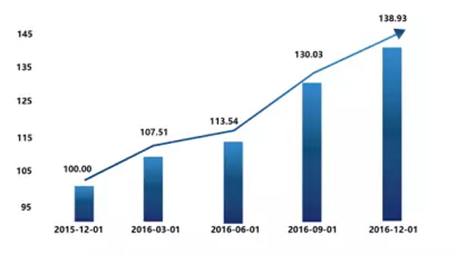 (2)引進企業數顯著提高。2016年第四季度引進企業指數達125.40點,環比上升7.94點,漲幅為6.76%,達一年峰值。 (二)時尚活躍度指數 時尚活躍度是維持一個區域時尚生命力與產品創新力的基礎,時尚活躍度指數專注于品牌的市場表現,從電商運營數、時尚平臺拓展數、新產品銷售額占比、企業合作占比和品牌傳播費用五個維度,反映出紡織行業在創建企業品牌,創新運行模式等方面的創造能力和創意思維活躍程度。2016年柯橋時尚活躍度指數增長迅猛,第四季度指數達138.93點,全年指數増長31.42點,漲幅為29.23%,漲幅巨大。 圖1-6時尚活躍度指數