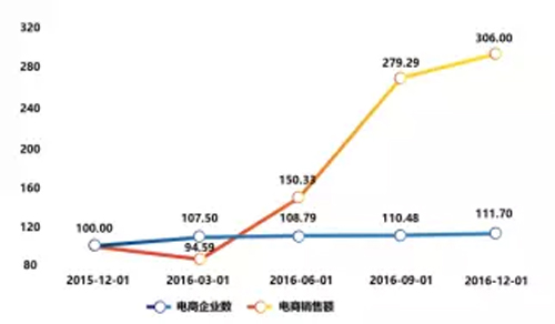 從細分指標來看,電商銷售額的大幅增長直接影響到電商運行指數的結果,早在2015年1月,柯橋區就出臺了《2014到2020年電子商務發展規劃》,詳述了柯橋區電商在未來的發展規劃。2016年,紹興市跨境電商巡回論壇在柯橋舉行,來自“四海商舟”、亞馬遜(中國)、eBay等業內人士作跨境貿易相關主題演講,這些都間接導致電商銷售額地快速增長。伴隨著2016年7月《柯橋區信息經濟發展“十三五”規劃(2016-2020年)》出臺,柯橋區電商發展恰逢其時、恰逢其市,將會在全球貿易一體化中釋放更大的能量。 圖1-8電商企業數&銷售額