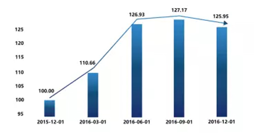 1、時尚設計人才指數 近年來,柯橋一邊大力引進外地設計師,一邊不斷培養、推廣本土設計師,越來越多設計師的加入和孵化,使得柯橋的時尚氛圍越來越濃厚。2016年第四季度時尚設計人才指數為104.10點,環比增加0.61點,漲幅為0.58%。 圖1-2 時尚設計人才指數