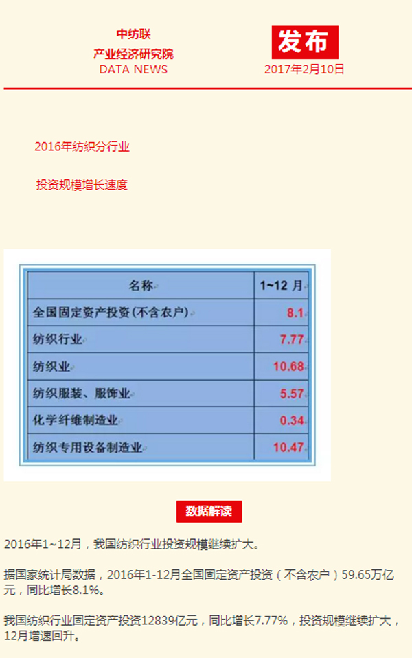 去年全年我國紡織業固定資產投資12839億元,同比增長7.77%。