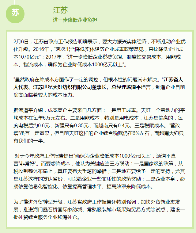 | 盤點(diǎn)各地兩會,江蘇、浙江、廣東等紡織大省都樹立了哪些促進(jìn)行業(yè)業(yè)發(fā)展小目標(biāo)? |