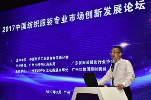 3月5日,由中國紡織工業(yè)聯(lián)合會(huì)流通分會(huì)主辦的“2017中國紡織服裝專業(yè)市場(chǎng)創(chuàng)新發(fā)展論壇”在廣州紅棉國際時(shí)裝城舉行。 中國紡織工業(yè)聯(lián)合會(huì)副會(huì)長、流通分會(huì)會(huì)長夏令敏,中國紡織工業(yè)聯(lián)合會(huì)原副會(huì)長、流通分會(huì)顧問楊東輝,中國紡織工業(yè)聯(lián)合會(huì)流通分會(huì)顧問張長林,東華大學(xué)教授、紡織服裝電商聯(lián)盟專家委主任湯兵勇,商務(wù)部電子商務(wù)專家咨詢委員會(huì)專家陳曙光,廣東省商業(yè)經(jīng)濟(jì)學(xué)會(huì)會(huì)長、廣東財(cái)經(jīng)大學(xué)流通經(jīng)濟(jì)研究所所長王先慶,阿里巴巴研究院副院長游五洋,廣東省服裝服飾行業(yè)協(xié)會(huì)會(huì)長卜曉強(qiáng),山東省紡織服裝行業(yè)協(xié)會(huì)會(huì)長劉建國,遼寧省紡織服裝協(xié)會(huì)會(huì)長王翀,安徽省服裝商會(huì)執(zhí)行會(huì)長葉梁,廣州市越秀區(qū)政協(xié)副主席胡仲華,廣州市越秀區(qū)流花街黨工委書記高貴良等領(lǐng)導(dǎo)與嘉賓出席了本次論壇大會(huì)。