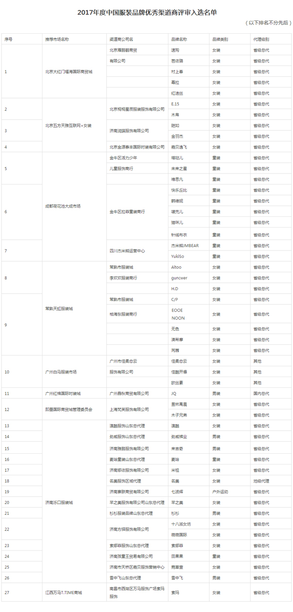 | 中紡聯流通分會發布2017年度中國服裝成長型品牌、優秀渠道商名單 |