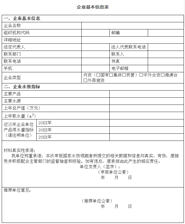 填寫說明 1、申報企業應認真閱讀《重點用水企業水效領跑者引領行動實施細則》,按照有關要求如實編寫申請報告,并提供必要的證明材料。 2、申請報告包含但不限于下列內容: (1)企業基本信息表 (2)企業水效分析報告 (3)企業自評表 3、以上材料需按順序編排,并在相應位置加蓋公章。