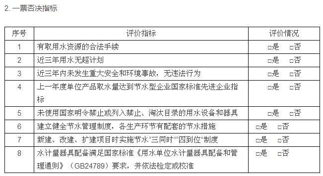 企業水效分析報告(格式) 一、基本情況 (一)企業基本情況 1.企業規模:包括企業地理位置(流域)、近三年的生產規模、產品結構、歷年產量產值、組織結構、員工人數; 2.生產情況:包括企業生產的主要原材料消耗、能源消耗、用水環節、主要用水設備等; 3.取用水情況:包括企業的取水水源(常規水資源、非常規水資源)、取水量、排水量、用水計量設備配備、用水計量、水質數據監測等情況。 (二)申請水效領跑者的相關生產情況 二、工藝及技術水平 (一)主要工藝流程 包括企業生產主要工藝流程,包括工藝流程圖等。 (二)主要用水設備規模及其技術水平 包括企業循環水系統、冷卻塔、換熱器、鍋爐、制冷、制氧、軟化處理、污水處理等主要用水設備的設備配置、服務區域、運行情況、處理能力等,以及主要用水設備的技術水平情況。 (三)與國內外同類企業相比在節水方面的突出做法 采取的先進節水工藝技術和裝備情況、節水技術改造項目情況、節水管理措施等。 三、取用水情況及水效指標 (一)主要用水工序、用水設備的取用水情況 包括企業生產主要用水工序、用水設備的取水量、排水量、水質情況等。 (二)近三年單位產品取水量及水效指標。 水效指標主要包括單位產品取水量、重復利用率、循環利用率、廢水回用率、用水綜合漏失率等。具體指標要求及報表格式依據以下標準的最新版本: GB 24789 用水單位水計量器具配備和管理通則 GB/T 7119 節水型企業評價導則 GB/T 26923 節水型企業紡織染整行業 GB/T18820-2011 工業企業產品取水定額編制通則 GB/T18916.4-2012 取水定額第4部分:紡織染整產品 GB/T18916.14-2014 取水定額第14部分:毛紡織產品 GB/T18916.20-2016 取水定額第20部分:化纖長絲織造產品 GB/T18916.21-2016 取水定額第21部分:真絲綢產品 GB/T18916.24-2016取水定額第24部分:麻紡織產品 GB/T18916.25-2016取水定額第25部分:粘膠纖維產品 再生化學纖維(滌綸)行業規范條件 四、水效提升經驗 (一)企業節水管理經驗。介紹企業在節水方面采取的管理措施、方法以及制定的相應管理制度以及取得的效果。 (二)企業節水技術改造經驗。介紹企業采用的先進節水技術、裝備和產品,采取的優化運行、水重復利用等方面的節水措施以及取得的節水效益。 (三)重大節水工程。介紹企業實施的重大節水技術改造工程,包括種類、數量以及因此取得的節水效益。 五、未來三年擬采取的主要水效提升措施 未來三年擬采取的主要水效提升措施,如節水技術改造項目(如水重復利用等)、節水管理措施(如合同節水管理等)。請分項簡述建設內容、預期投資和預期節水效果。 六、證明材料 此部分包括但不限于以下材料: (一)企業營業執照復印件,企業組織機構代碼證復印件; (二)企業取用水相關證明材料(取水許可證或用水合同協議、廢水達標排放、近三年用水無超計劃等。若地方部門并無相關證明,可由企業書面做出相應承諾); (三)企業用水相關材料(企業用水記錄、統計報表、費用賬單、水計量器具臺賬、供排水管網圖、維修及校驗記錄等); (四)企業用水設備相關材料(用水設備設計圖紙、設備配置情況、運行記錄等); (五)企業節水管理相關材料(水平衡測試報告、節水管理制度文件、節水規劃和年度節水計劃文件、節水統計報表等)。 七、企業自評表 1. 自評總則 (1)水效領跑者企業自評表分為一票否決指標和量化評價指標。 (2)一票否決指標如有不滿足項,取消該企業水效領跑者評選資格,不參加后續量化打分。 (3)量化評價分管理考核指標和技術考核指標。管理考核指標總分達到48分,且技術考核指標達到表中最低限值,才具備申報條件。