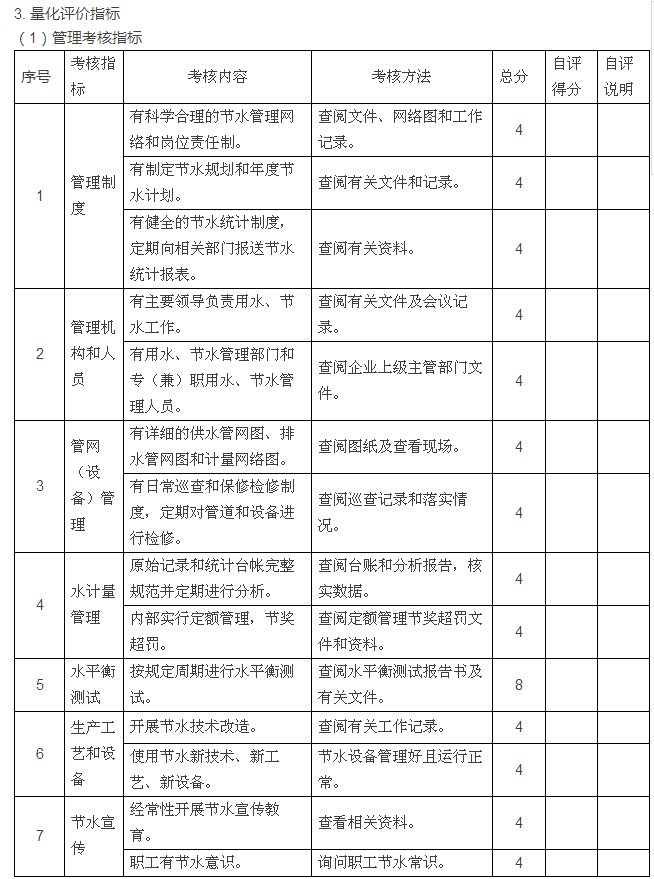 注1:1)自評打分依據:1.企業管理考核的計分標準滿分為60分,得分在48分以上(含48分)的企業達到水效領跑者企業管理考核指標的要求;2)相關文件、資料、記錄等齊全完善的滿分,缺一項扣1分,數據不實的扣1分;3)針對第6項生產工藝和設備的考核中,節水設備運行正常且管理嚴格的滿分,運行有缺失的扣1分,管理不完善的扣1分。 注2:自評說明:附上相關文件、記錄等證明自評得分的材料。 (2)技術考核指標 各行業企業根據計算方法中的計算公式計算本企業的技術考核指標值,并給出相應的計算過程。