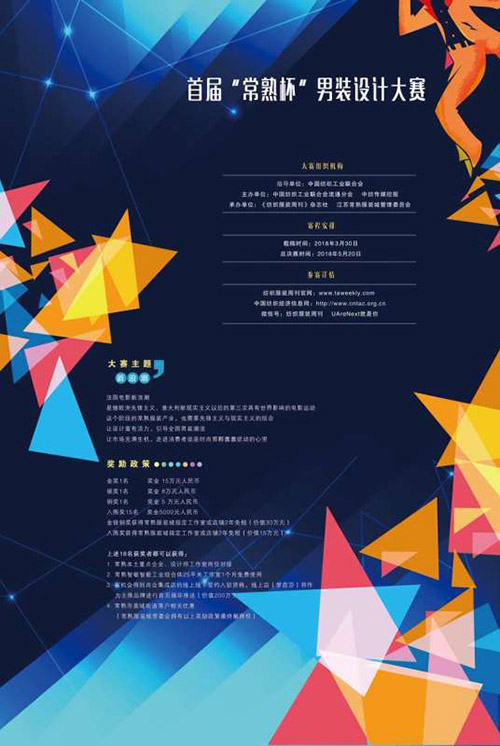 首屆“常熟杯”中國男裝設計大賽將面向全國征稿,包括:中國原創品牌獨立設計師,國內服裝企業在職設計師,服裝設計師工作室及機構設計師,服裝市場集群發展型設計師,各大服裝院校服裝系教師,熱愛設計、希望在男裝領域有所發展的設計師等。
