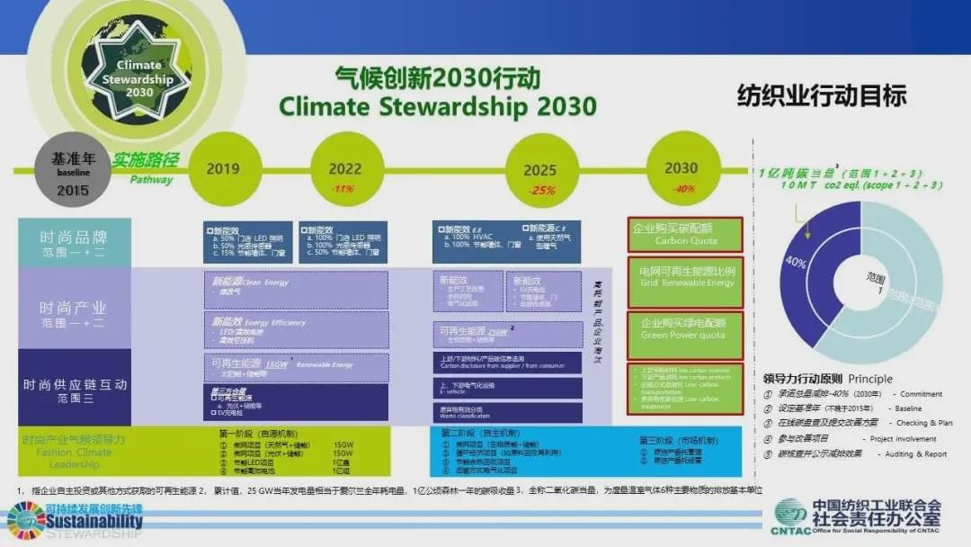 中國紡織工業聯合會社會責任辦公室是國內紡織行業推動可持續發展的官方組織,2019年,社責辦就推出“時尚氣候創新2030行動”,其目的是,聯動企業,建立應對氣候變化的企業商業模式。 幾年時間內,氣候創新行動的力量不斷壯大,吸引了李寧公司、賽得利集團及其8家下游價值鏈伙伴、盛泰集團、晨風集團、勁霸男裝、如意集團、華孚集團,以及柯橋區等的加入。