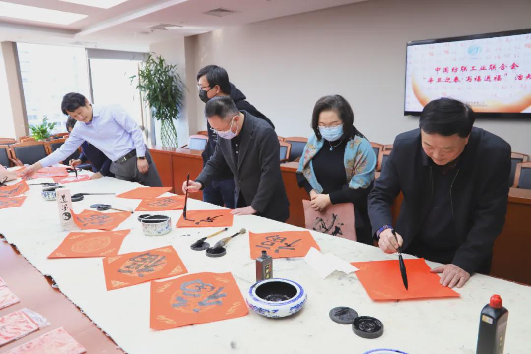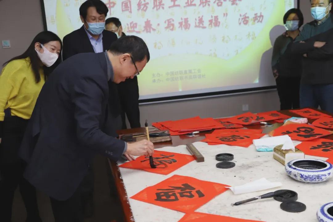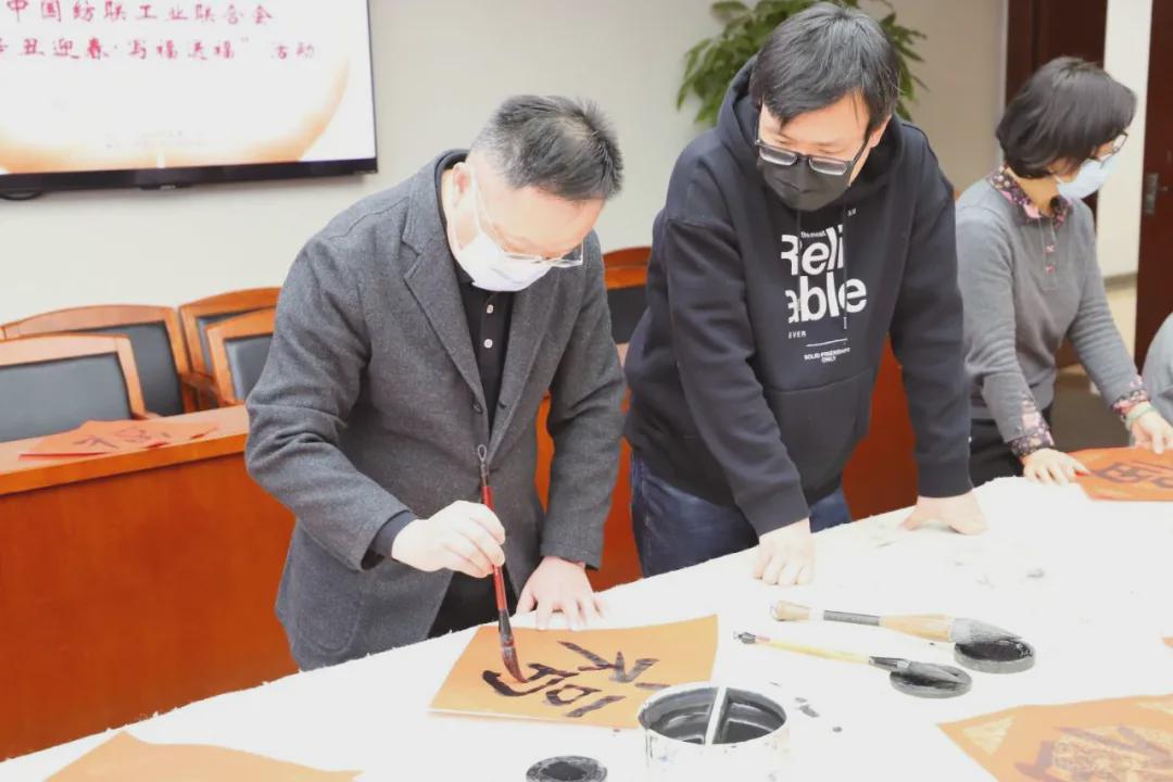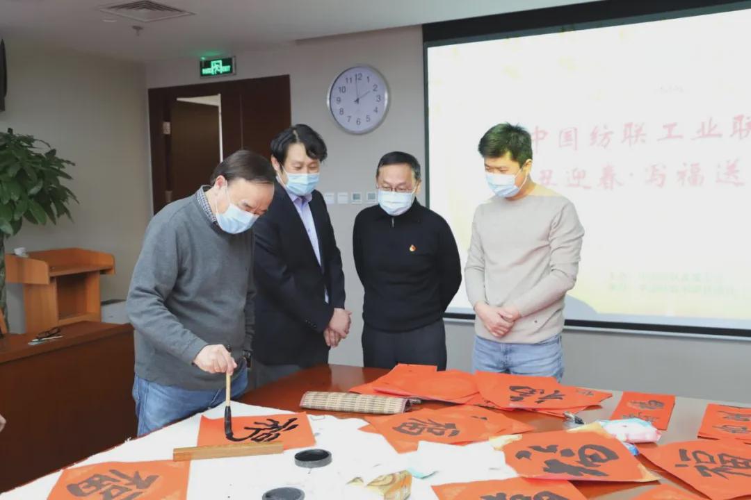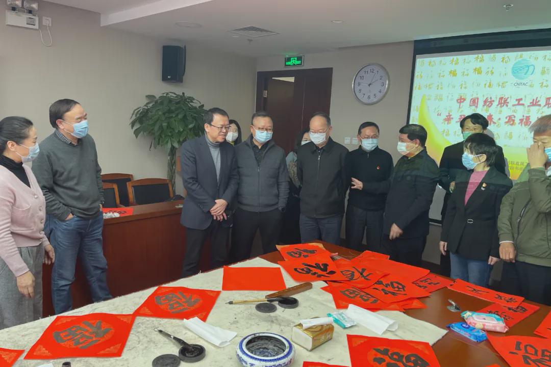 伴隨著《喜洋洋》喜慶的旋律,中國紡織工業聯合會黨委書記兼秘書長高勇,會長孫瑞哲,黨委副書記陳偉康,紀委書記王久新,副會長徐迎新、李陵申、楊兆華、孫淮濱等領導步入會場與中國紡聯工會委員代表、書畫聯誼社社員、職工代表一起“點福送福”“寫福傳福”共迎新春,向中國紡聯全體干部職工和全國紡織行業2000萬干部職工送上最“牛”祝“福”。