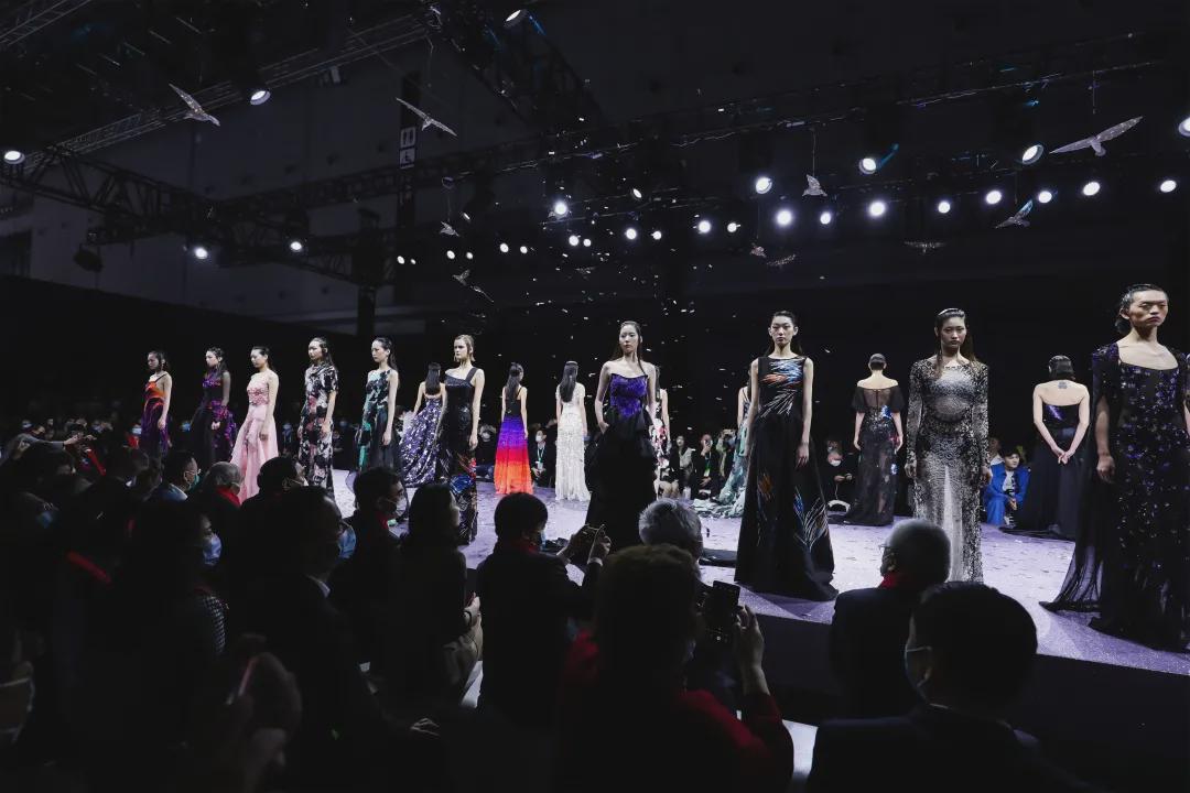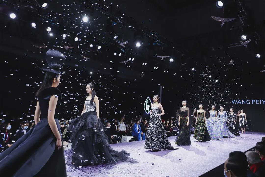 發布當天,由中國頂尖服裝及跨界設計師王培沂匠心打造的“纖維流行趨勢十年-跨界時尚匯風尚大賞”美不勝收,熠彩沁心。設計師用最前沿的面料、最具國際水準的設計理念和匠心工藝在發布現場呈現了一場唯美大氣的纖維盛宴;一襲襲華麗的高定禮服如行走的藝術品綻放著絕美與浪漫,一件件精致的帽飾搭配與華服遙相呼應、優雅大氣,簇簇亮片仿佛被風吹落在裙邊、光芒四射,手工刺繡宛如美麗的浮雕掠過裙裾;每一款禮服的設計都充滿耐人尋味的創意細節。特別值得一提的是,作為高圓圓、楊冪、謝娜等女明星禮服定制設計師,王培沂在本季秀服的設計上運用了桐昆集團最新的綠色纖維面料進行創作,來呈現中國可持續時尚、綠色纖維產業發展風尚,梳理近十年中國高定禮服設計歷程。