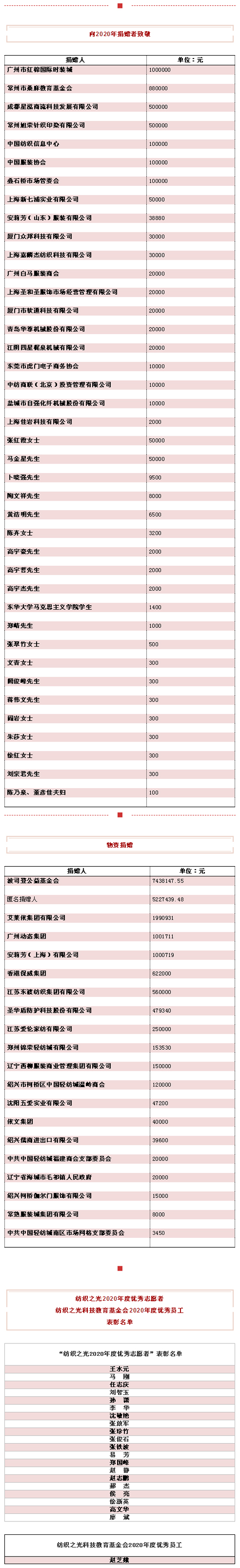 張翠竹作基金會2020年度工作總結。2020年,在中國紡聯領導的統一部署下,基金會堅持以促進紡織科技進步和培養人才為工作重點,秘書處全面落實紡織之光科技教育基金會第三屆第四次理事會會議工作部署,按照國家相應的法律法規要求和《紡織之光科技教育基金會章程》 ,合規地開展和管理科技、教育、技能人才獎勵等行業公益項目,募款的同時進行資金保值增值,加強信息公開和內部管理,確保基金會規范運作。作為慈善組織,為配合 2020 年實現全面脫貧目標,按照中國紡聯扶貧工作委員會的工作部署,基金會組織在甘肅、貴州、江西、新疆等地開展了“紡織之光·愛益行”服裝等物資捐贈慈善活動。在抗擊疫情的防控狙擊戰中,基金會也積極參與了馳援湖北武漢、孝感等地的抗疫工作,為一線的醫護工作人員募款、募集防寒服,購買醫療物資等。 對于2021年度工作,2021年是紡織之光科技教育基金會獎勵科技教育25周年, 基金會將繼續資助推動科技進步、培養人才的公益項目,結合紡織行業特點,為愛心的企事業單位搭建振興農村的平臺和通道,逐步提升基金會在紡織行業和慈善領域的“紡織之光”品牌形象。 近年來,由于中美貿易摩擦和疫情影響,行業效益增速減緩,大額貨幣捐贈難度加大,同時各項公益需求不斷提高,基金會保值增值壓力不斷增加,基金會將進一步拓展收入渠道,發揮公益委員會、基金會理事募捐籌款作用。擬采取以下措施:一是今年在行業內新增貨幣捐贈300萬-500萬元;二是推動新建和擴大專項基金收入;三是推進落實項目籌款;四是堅持“安全、合規、有效”的前提下,開展投資理財,計劃降低信托理財比例,擴大公募基金投資比例;五是加強逾期理財產品的處置;減少投資損失。 2021年各大類公益項目支出均有增加 基金會辦公室主任趙芝娥就2020年度財務決算報告和2021年度財務預算安排進行說明。2020年末基金會凈資產 11384.43 萬元,2020年總收入3170.65萬元,公益慈善活動支出3299.19萬元,符合《慈善法》和《關于慈善組織開展慈善活動年度支出和管理費用的規定》中,年度慈善活動支出不得低于上年末凈資產的6%的規定。 為做好 2021 年紡織之光科技教育基金會預算,基金會秘書處充分征求了相關項目承擔單位意見,結合本年度工作計劃,堅持量入為出,確保重點原則下,編制了 2021 年度收支預算:本年度預算總支出 1679 萬元,預算總收入 1286 萬元。在社會慈善類支出大幅度減少的同時,科技類、教育類、技能人才類、鄭敏泰中國針織(內衣)基金等各大類公益項目均比上年實際支出有所增加。主要原因是今年隨著疫情防控形勢逐步好轉,各項工作將恢復正常,預算需求有所增加。 基金會副秘書長陳思奇就修訂部分內部管理辦法進行了說明。 確定未來五年發展戰略目標 葉志民介紹了紡織之光科技教育基金會五年發展規劃框架。未來五年發展戰略目標:持續有效發揮引領和促進紡織行業科技教育人才發展作用是基金會發展的目標任務。必須持續優化獎勵結構,提高對紡織科技、教育事業做出重要和重大貢獻的科教學人員的激勵作用;必須不斷提高推動科技教育成果轉化效果,開展資助技術交流和項目宣傳活動;必須支持應用基礎研究,突出獎勵為應用基礎研究活動做出貢獻的科技人員。 具體目標是未來五年,每年用于紡織科教事業的公益支出逐步達到1100萬元,基金會凈資產逐步達到1.5億元。 葉志民還宣讀了調整基金會有關負責人、理事的決定。彭燕麗到達退休年齡,不再擔任基金會副理事長。 會議還對捐贈人、2020年度“紡織之光”優秀志愿者、優秀員工進行了表彰。 在討論環節,陳大鵬認為,基金會為行業科教事業發展起到了很大促進作用,當前形勢下,籌措資金也面臨困難。行業的事要靠全行業的努力,以往大企業捐贈比較多,希望今后捐贈不分企業大小,不分資金多少,集腋成裘,重要的是在全行業形成捐贈為榮的風氣,靠大家共同努力為行業科教事業做貢獻。 葉志民在總結中說,過去一年里,基金會在抗疫、扶貧等工作中取得了很大成績,體現了行業的責任形象。與此同時,也宣傳了行業科技、綠色、時尚的全新發展理念。基金會的發展離不開各位領導和各專業協會的支持。2021年是“十四五”開局之年,基金會在繼續做好支持科教的同時,要優化各個公益項目,把每一分錢用好。此外,要利用各種機會,讓行業了解基金會、認識基金會、支持基金會。基金會將繼續堅持初心和使命,與各方攜手合作,將基金會打造成為愛心企業家的交流平臺、紡織行業慈善平臺。 夏令敏最后表示,過去一年,基金會克服了各方面的困難,在聯合會和各位理事的支持下,很好地完成了各項工作。在抗疫過程中發揮了行業公益組織的特點,為支持抗疫工作發揮了重要作用,體現了自身價值。2021年,希望基金會在保障資產安全的情況,進一步實現保值增值,努力控制并降低風險;要拓展收入渠道,廣開思路,利用自身影響力和多種渠道為基金會籌資開拓更多道路;要更加注重獎勵實效,對科技、教育、技能人才獎勵效果進行科學評估,把錢用好用到位;加強內部規范化管理,提升管理水平。