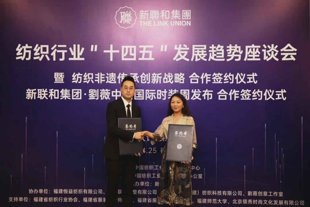 隨著經(jīng)濟(jì)的不斷發(fā)展,越來越多的人開始追求更高的生活品質(zhì),以綠色、環(huán)保、自然、親膚為特點(diǎn)的植物染面料重新回到人們的視野并成為時(shí)尚消費(fèi)的新趨勢(shì),這也為非遺植物染進(jìn)一步融入現(xiàn)代人的生活與消費(fèi)提供了巨大的可能。 名師引領(lǐng),紡織非遺煥發(fā)新生 在本次會(huì)議上,新聯(lián)和集團(tuán)與中國紡織工業(yè)聯(lián)合會(huì)非遺辦就“紡織非遺傳承創(chuàng)新戰(zhàn)略合作”進(jìn)行了簽約,并且正式宣布將與中國紡織非遺推廣大使、金頂獎(jiǎng)設(shè)計(jì)師劉薇在中國國際時(shí)裝周上進(jìn)行聯(lián)合發(fā)布。據(jù)悉,在北京完成中國國際時(shí)裝周的發(fā)布后,新聯(lián)和與劉薇還會(huì)陸續(xù)在深圳、青島、上海、福建等各地時(shí)尚舞臺(tái)進(jìn)行持續(xù)性的發(fā)布活動(dòng)。