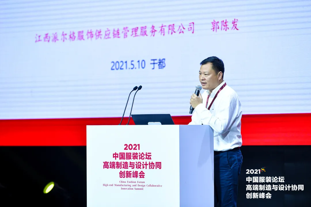 同樣聚焦牛仔智造,江西派爾格服飾供應(yīng)鏈管理服務(wù)有限公司董事長(zhǎng)兼總經(jīng)理郭陳發(fā)在“派爾格牛仔智造新模式探索”主題演講中分享了其從事牛仔服裝20多年琢磨出來(lái)的數(shù)字化、智能化打法。正是深諳牛仔行業(yè)制造資源在向低成本遷移、員工收入低、訂單碎片化、工序變化復(fù)雜等痛點(diǎn),派爾格定位做牛仔服裝供應(yīng)鏈管理服務(wù)型企業(yè),運(yùn)用云服裝設(shè)計(jì)平臺(tái)、牛仔洗水工藝信息平臺(tái)、牛仔面輔料信息平臺(tái)、數(shù)字化工廠及智慧物流按柔性生產(chǎn)網(wǎng)絡(luò)協(xié)同制造,滿足B端零售商及C端消費(fèi)者的產(chǎn)品需求。