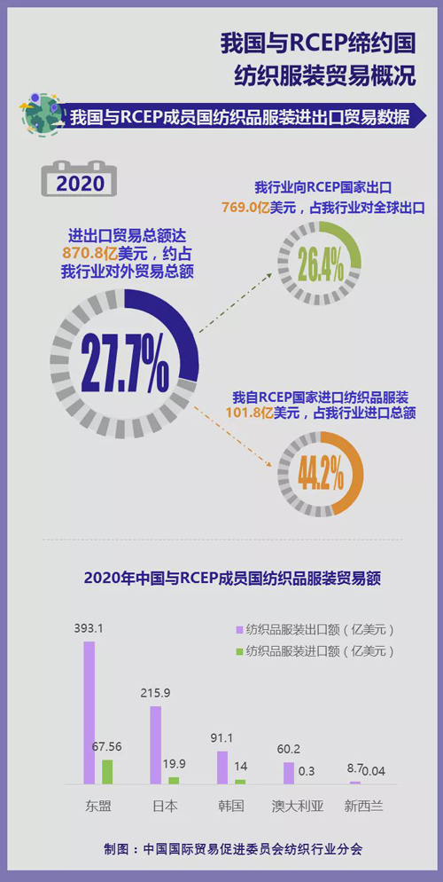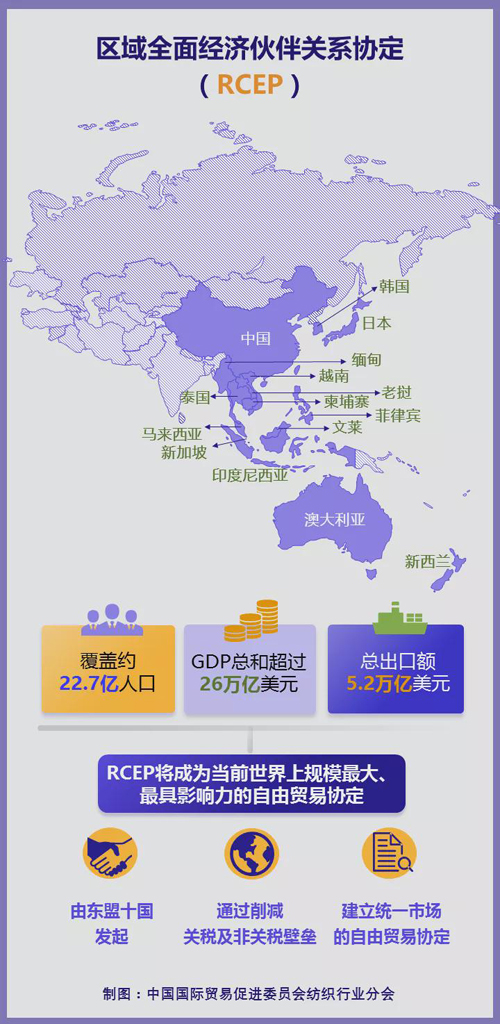 2022年1月1日,《區(qū)域全面經(jīng)濟伙伴關(guān)系協(xié)定》(RCEP)陸續(xù)在15個成員國正式生效,這標志著全球人口最多、經(jīng)貿(mào)規(guī)模最大、最具發(fā)展?jié)摿Φ淖杂少Q(mào)易區(qū)正式落地。 我國作為紡織出口大國,產(chǎn)業(yè)鏈完備,且具備較強的國際合作和融合發(fā)展優(yōu)勢。同時,RCEP成員國是我國紡織服裝原材料及成品出口的重要市場,我紡織產(chǎn)業(yè)鏈中上游規(guī)模化優(yōu)勢也十分明顯。隨著RCEP的生效實施,我紡織業(yè)區(qū)域發(fā)展前景備受關(guān)注。