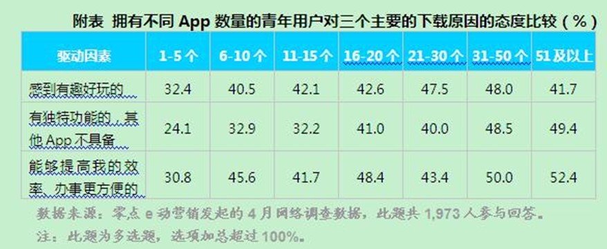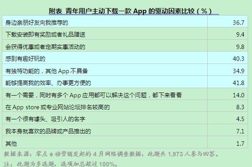 用強關系推動你的App營銷吧 要吃到這塊蛋糕,第一個問題:在什么樣的情境下,用戶愿意去下載一個App? 刺激青年網用戶動下載一個App,我們或許可以想到很多方法,有折扣、綁定業務、廣告推薦亦或者刷榜……然而,對于用戶來說,手指頭動一動很容易下載,手指頭動一動也很容易卸載,你愿意看到這樣的情況么? 這里我們奉上App設計和營銷兩個訣竅: 內容上必須好玩、有用和獨特;傳播上抓住熟人圈子。 數據顯示,超過四成(40.3%)的青年人表示,“當我感到這個App有趣好玩,這可能會促使我去下載它”;如果“它能提高我的效率、辦事更方便,也會促使我下載它”(41.8%),當然這個App“有獨特功能的,其他的App都不具備”(34.9%),那我也會去下載它。 而且,當用戶手機中的App數量越多的時候,他們對“好玩”、“獨特”、“提高效率”這三點的要求就更明顯。 互聯網讓世界變得平了,也讓我們的用戶變得更專業化。日常生活中的360°體驗都可能影響消費者的抉擇、提升他們的需求基準線,而消費者也愈發傾向一種跨界的體驗,所有優秀的服務和優質的產品,都應該相通——在其他產品上獲得卓越體驗與經驗,消費者們會不自覺轉嫁到對你的產品要求上。 不管是App還是別的,你得準備足夠的干貨。