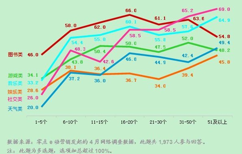 讓各類或娛樂、或益智的小應用充滿了用戶日常生活的閑暇時光,讓吃穿住行玩都離不開網絡的聯系和幫助的青年人在手機端保持在線的狀態,隨時獲得各類便攜式服務,成為青年人最主要的需求。 另一個有趣的現象,我們發現手機中擁有App數量越多的用戶,表示自己擁有最核心的幾類App應用的比例就更高,而其他外圍App應用的比例卻并沒有隨著人們下載的數量而增加。 |